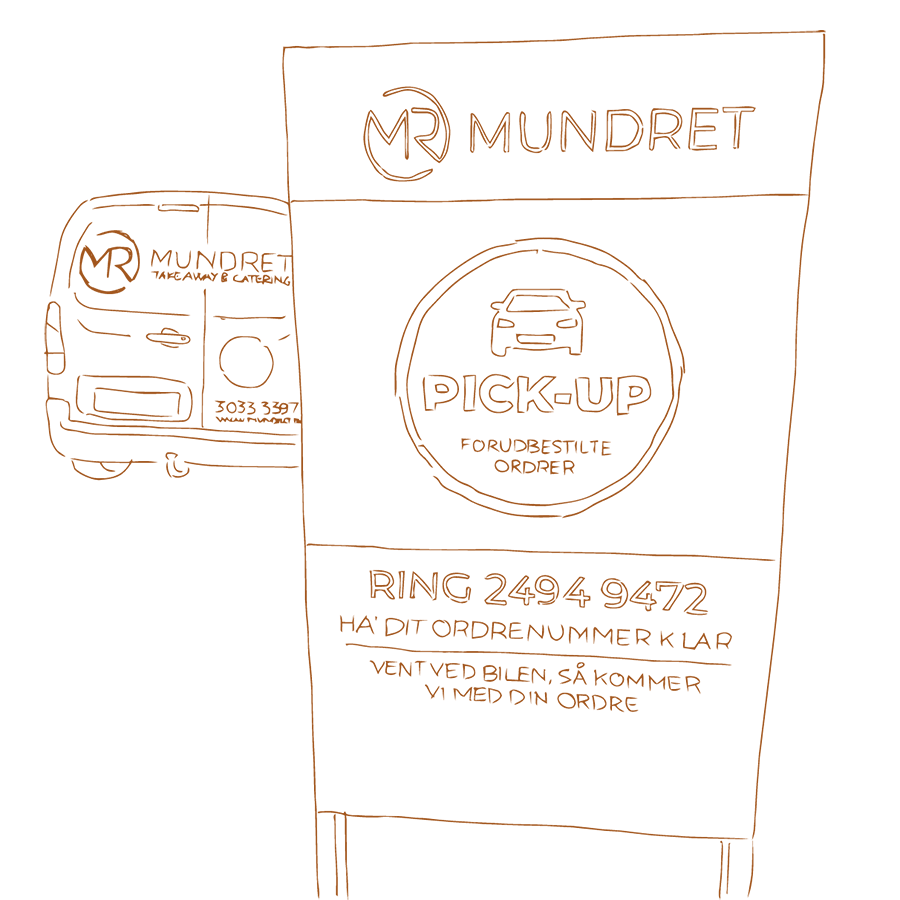 Take away (ingen minimums bestillinger) Bestillinger på over 6.000 til afhentning i vores butikker, skal bestilles senest 72 timer før. Efter denne deadline bedes du kontakte info@mundret.dk, for at høre om dine muligheder.